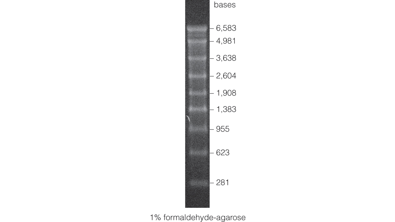 Promega RNA Markers are suitable for size estimation of single-stranded RNA from 0.28–6.58kb in glyoxal or formaldehyde-agarose gels. The RNA Markers consist of a ladder of nine RNA transcripts that are synthesized in vitro from specific templates. The sizes are 281, 623, 955, 1,383, 1,908, 2,604, 3,638, 4,981 and 6,583 bases. The markers are not intended for use in quantitative analysis. After electrophoresis, the fragments can be visualized by ethidium bromide staining.